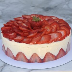 Traditional fraisier made with almond sponge, layered with light cream and fresh strawberries