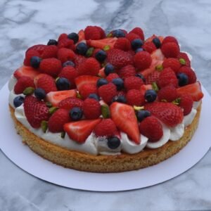 Sweet pastry crust, almond cream, fruit confit, vanilla whipped ganache and fresh berries
