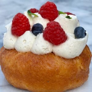 Individual yeast cake soaked in rum syrup topped with whipped cream and fresh fruits